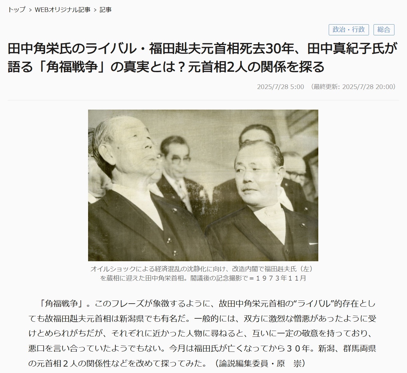 7月28日、故郷の新潟日報記事「田中角栄氏のライバル・福田赳夫元首相死去30年、田中真紀子氏が語る「角福戦争」の真実とは?元首相2人の関係を探る」にコメントを掲載いただきました。